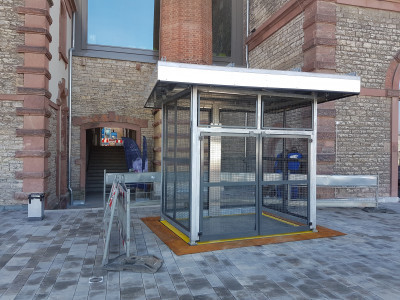 Hebebühne für Gütertransport in einem Schacht, mit Absturzsicherungen und Aufzug-Drehtür abgesichert. |