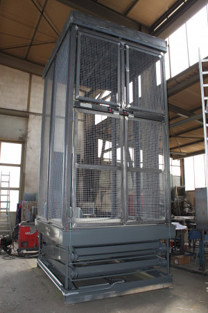 Hebebühne mit 3 gegenüberliegenden Haltestelle mit entsprechend verriegelten Türen. |